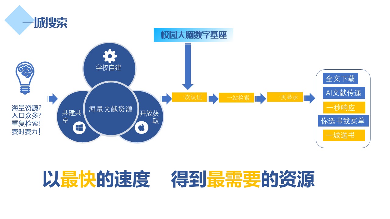 文献数字化推动了数字阅读的普及。然而受到检索能力、访问限制、时间成本、数字资源爆炸式增长等因素影响,师生在使用数字资源时仍面临文献服务模式难以助力师生文献发现、网络控制访问难以提升师生服务体验、多库文献查询难以节约师生时间成本等问题的困扰。“一城搜索”应用场景,通过“一秒响应”“一次认证”“一站检索”三个“一”,有效解决了这些难点痛点问题。“一秒响应”,快速助力师生文献发现;“一次认证”,无障碍检索图书馆文献信息资源;“一站检索”,跨库检索到有价值的资源。